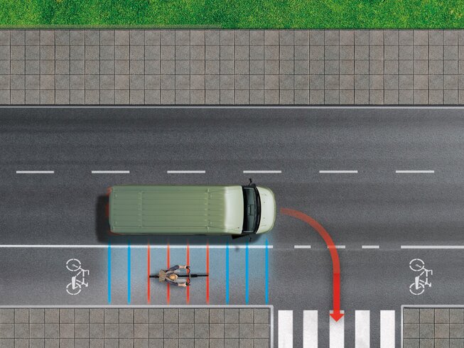 Diese Funktion ermöglicht ein sicheres Abbiegen, indem sie potenzielle Kollisionen mit Fahrzeugen oder gefährdeten Verkehrsteilnehmern verhindert und im Ernstfall automatisch einen Bremsvorgang einleitet.